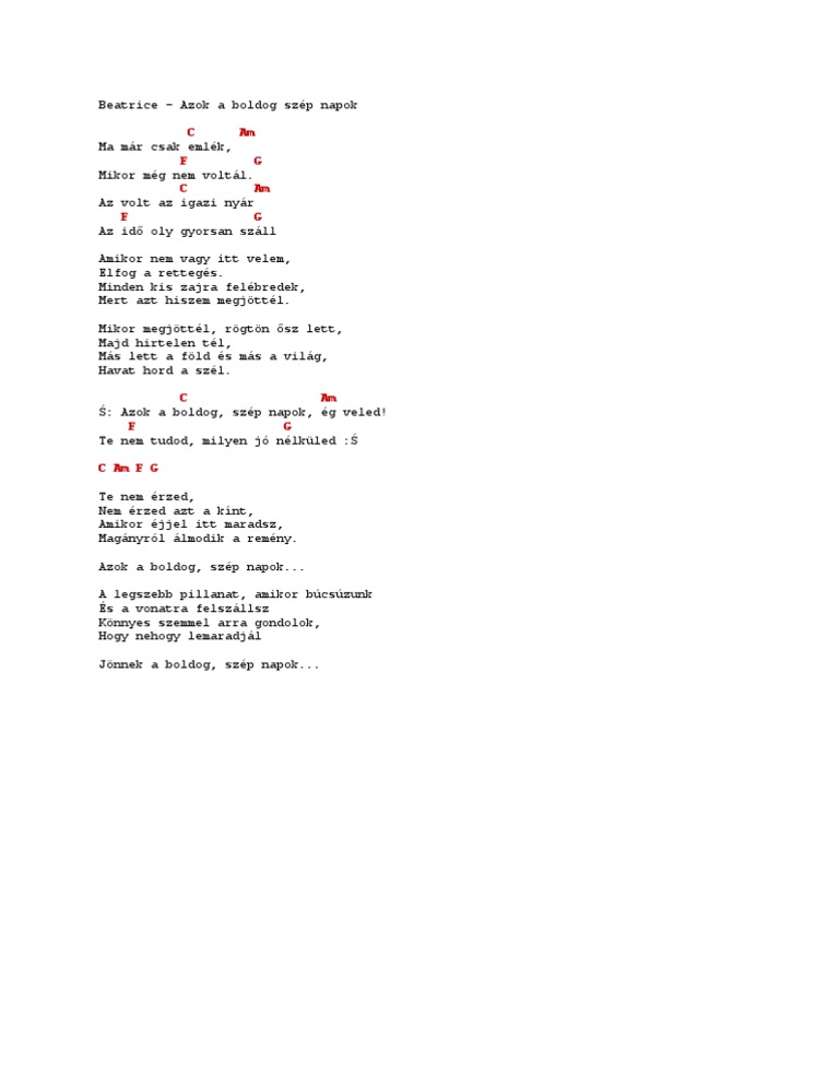 Azok a boldog szép napok már csak emlék mikor még nem voltál. Te nem tudod milyen jó nélküled. Az élet oly nehéz de győzni kel és kész az ifjúság a jövőtől nem fél. Irány a többi beatrice dalszöveg amennyiben a dalszöveg megjelenésével kapcsolatban jogi kifogásod van ide kattintva jelezheted azt felénk.